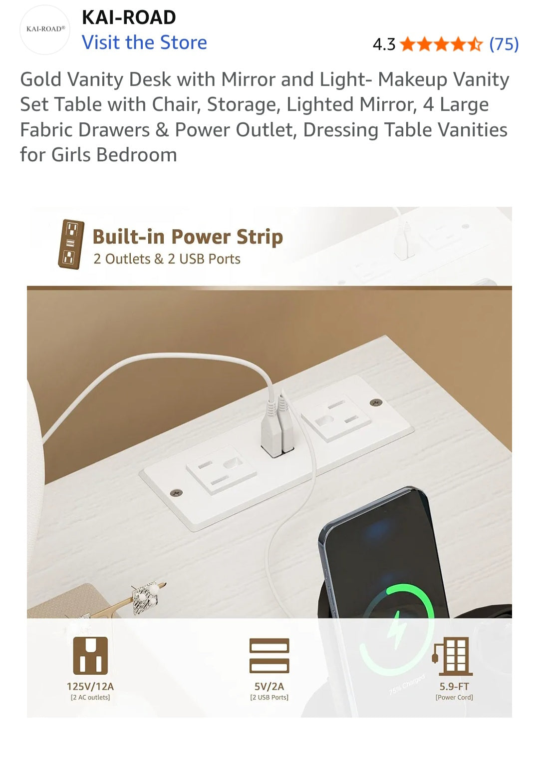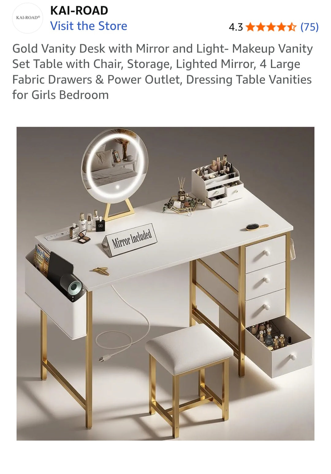 "Get ready in style with our 47" Desk, complete with a light-up mirror and matching stool. The perfect addition to your vanity, the white and gold design adds a touch of glamour to any space. Say goodbye to boring routines and hello to a fabulous new way to get ready! (mirror light bulbs not included)"